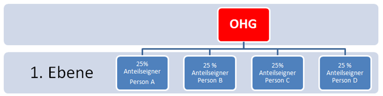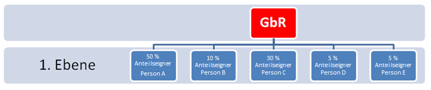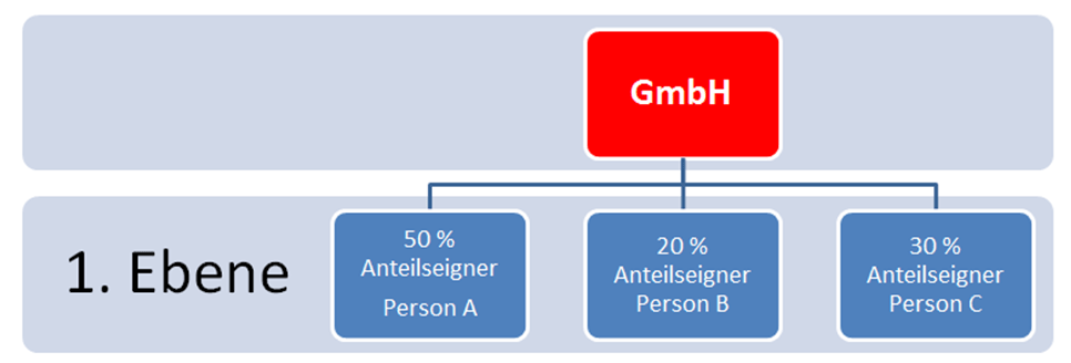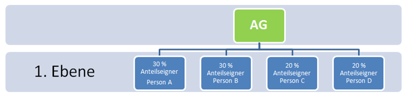 Es besteht für die nicht börsennotierte Aktiengesellschaft nicht die Möglichkeit von der Erleichterungsregelung aus Fall 1. Deshalb wird nach dem normalen Prüfverfahren vorgegangen. Hiernach haben die Personen A und B jeweils den Schwellenwert von mehr als 25 Prozent erreicht und sind als wirtschaftlich Berechtigte zu erfassen.